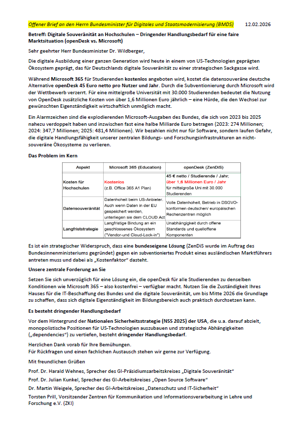 Experten des GI und des ZKI e.V. haben in einem offenen Brief an Bundesminister Dr. Wildberger dringenden Handlungsbedarf für eine faire Marktsituation an das Bundesministerium für Digitalisierung und Staatmodernisierung adressiert (OpenDesk vs. Microsoft)